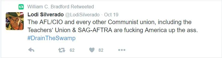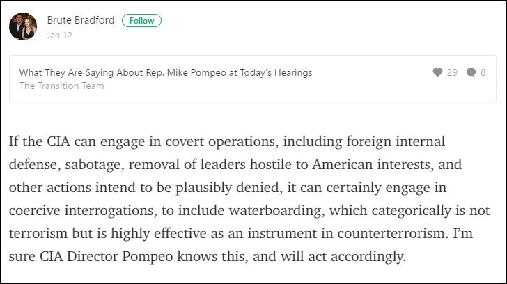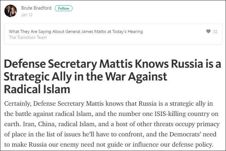 Bradford also has a Medium account, which is still online. There are no articles/postings from him on it, but there are several comments he made, always in response to postings from the Trump transition website greatagain.gov, which is a Medium site. (Here's an archive of Bradford's comments in case they disappear.)